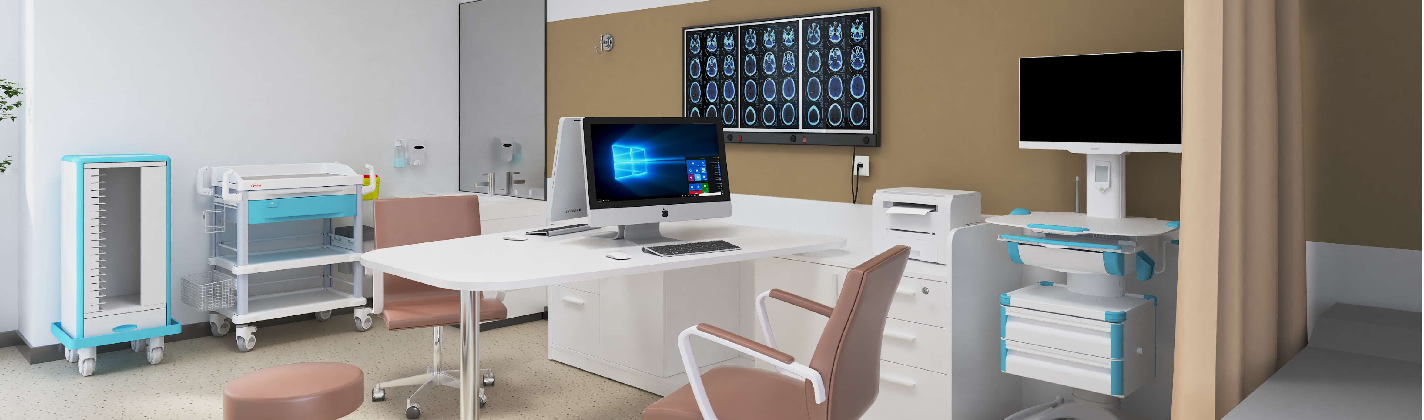 This trolley is equipped with all-in-one PC with power supply installed at the bottom of the trolley. The monitor above the trolley can be viewed from multiple perspectives. A color power display is installed on the post above the tabletop. Equipped with wireless keyboard and mouse kit, the all-in-one PC contains a built-in camera, microphone and speaker; users can customize the battery temperature alarm, low battery alarm. Also can check charging and usage condition of all batteries of online devices through the client and server when connected to the network. Aluminum and ABS plastic profile frame, practical, light and artistic. ABS plastic top with guardrail, ABS plastic flanged tabletop,offers effective anti-permeation,corrosion-resistance,wear- resistance,and easy to clean. There are four beams at both left and right side of the trolley, used to place accessories, the height is adjustable. A sliding shelf under the worktable on the left can extend the working area of the medical care personnel. A pedal wastebin is installed on the right side of the trollley,clean and easy operation.